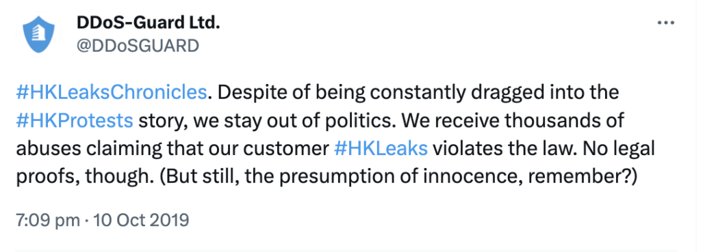 hkleaks[.]pk 2019-11-10 (date of the first resolution on DDOS-Guard. The domain had likely been first registered earlier, although it cannot be confirmed if by the same actors.)
