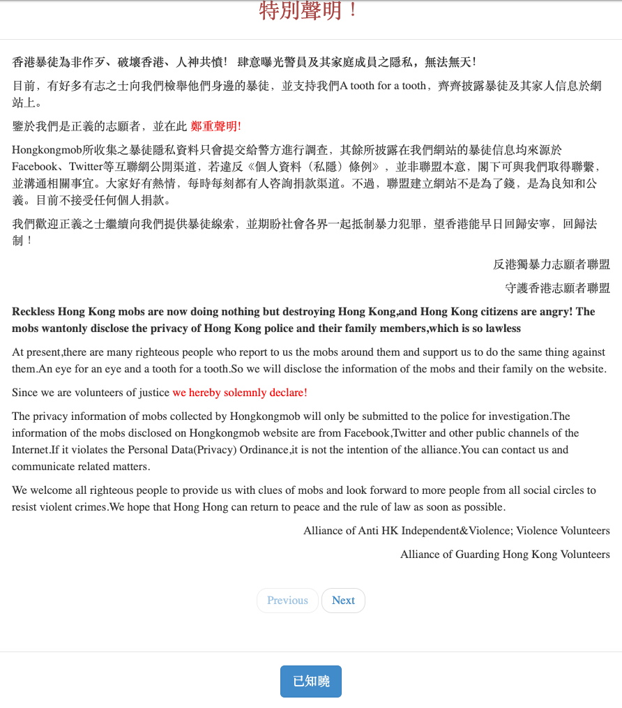 The website was almost immediately denounced by the protest movement and its supporting online community. As the website quickly went down — to date the cause remains unclear — it was immediately replaced with a stream of new websites hosted on domains that all used the same “hkleaks” naming convention, as we will illustrate in detail later in this report.