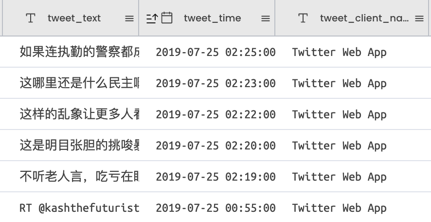Figure 35: Screenshot of the last tweets sent in the datasets shared by Twitter. The data was processed in Gigasheet by the authors. The date and timestamp are shown in the central column — tweet_time — and display the date July 25, 2019.