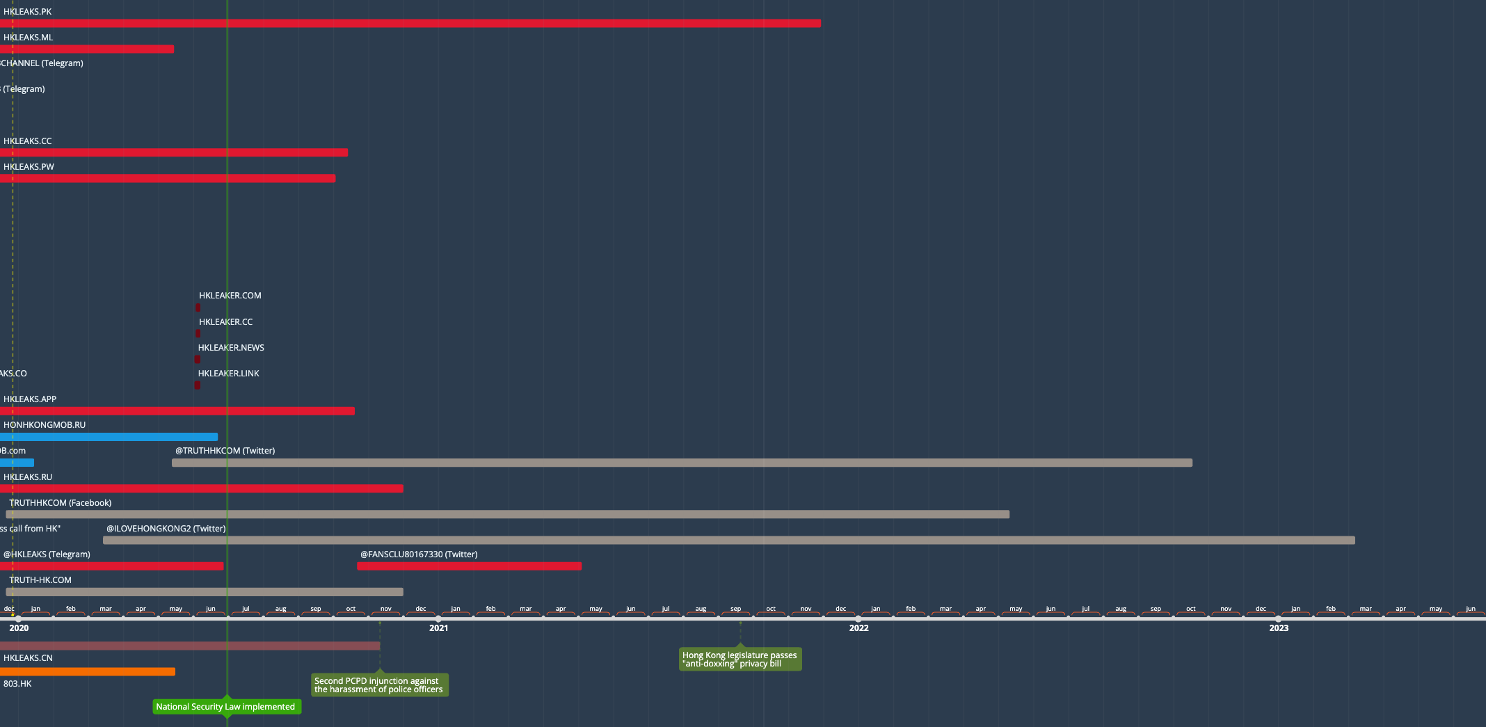 In August 2019, at the height of the Anti-Extradition Bill protests that rocked Hong Kong, a series of websites branded “HKLEAKS” began surfacing on the web. Claiming to be run by anonymous citizens, they systematically exposed (“doxxed”) the personal identifiable information of protesters, journalists, and other individuals perceived as affiliated with the protest movement. A number of analyses [1, 2, 3, and more] over the subsequent months and years, as well as individual observers, surfaced several peculiar features of this operation, from the dodgy Russian-based hosting of its web domains, to the synergy with Chinese state media, to the suspicious sourcing of the data used for the doxxing.