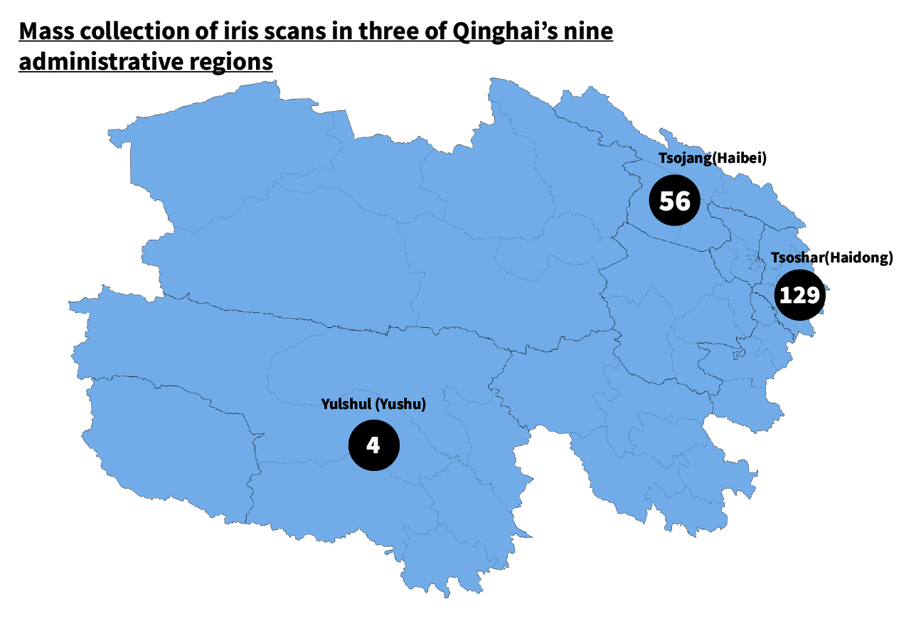 Since March 2019, police in Qinghai Province have conducted a program of mass iris scan collection. Based on our analysis of 189 publicly available sources, we believe that between March 2019 and July 2022 police in three regions of Qinghai – Tsoshar, Tsojang, and Yulshul – collected iris scans from a total of between 1.2 million and 1.4 million people, or between one fifth and one quarter of Qinghai’s total population. These people do not appear to be accused of any criminal offense nor victims of any crime. Instead, police have effectively treated entire communities as potential threats to social stability.