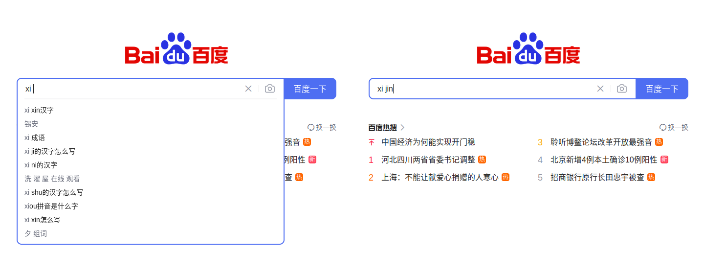 Figure 1: Left, Baidu censoring mention of “Xi Jinping” in autosuggestions for “xi” followed by a space; right, Baidu censoring all autosuggestions for “xi jin”.