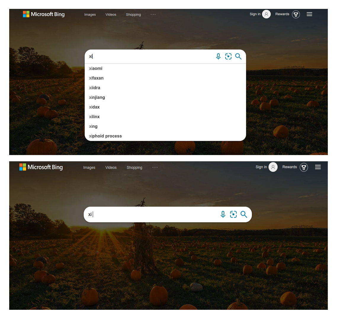 Figure 2: Top, October 2021 autosuggestions for “xi” in the United States English locale which contain no mention of Xi Jinping; bottom, a complete absence of autosuggestions for “xi␣”. Our December 2021 measurement findings were analogous.