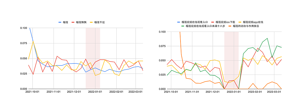 Figure 12: Search trends for autosuggestions for 榴莲 (durian) not affected (left) and affected (right) by the shutdown.