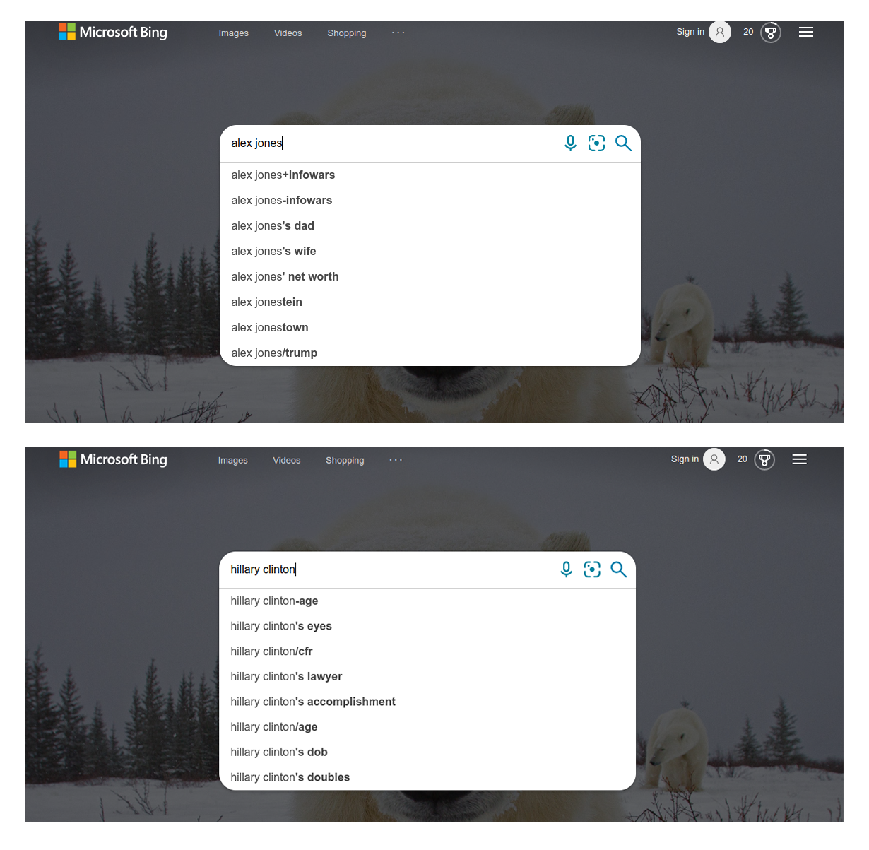 As we discussed earlier in the report, Bing’s autosuggestions for Hillary Clinton are anomalous, as Clinton’s name is never suggested by itself nor followed by a space and in every suggestion her name is followed by punctuation. While many searches beginning with “hillary␣clinton’s” (“hillary␣clinton” followed by an apostrophe and “s”) such as “hillary␣clinton’s␣age” may be naturally typed, we find it unlikely that there are many queries typed in with her name followed by hyphens or slashes such as “hillary␣clinton-age” or “hillary␣clinton/age”. Nevertheless, we find these spurious autosuggestions suggested by Bing.
