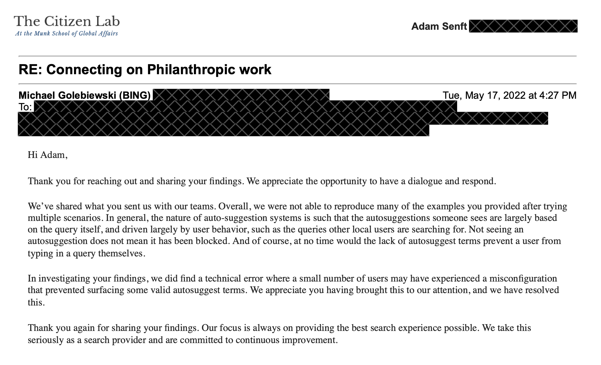 We would like to thank Microsoft for considering and replying to our letter. With respect to some of our findings from our December 2021 experiment being no longer reproducible in May 2022, we recognize in our report that the censorship of autosuggestions which we characterize through our research fluctuates over time. However, we have observed that the direction of fluctuation is not always in the direction of reducing censorship.
