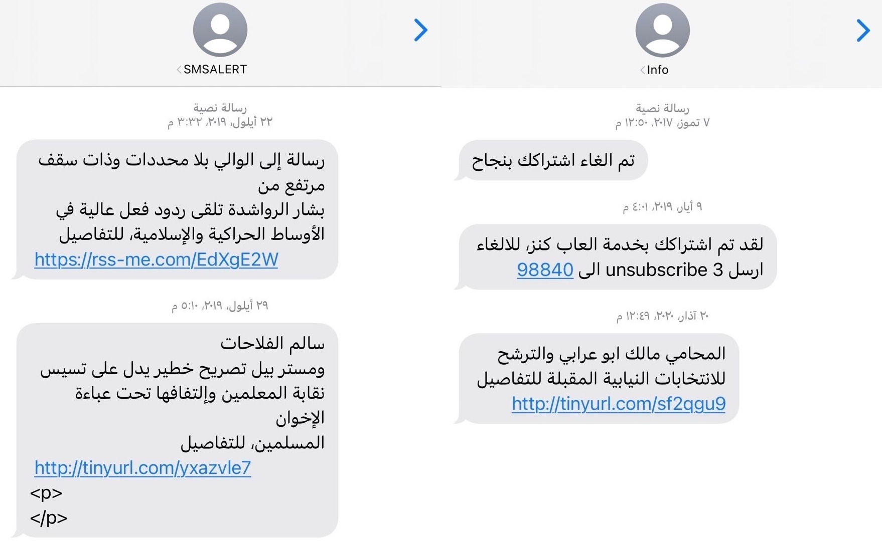 - We assess that at least two of the four targets were hacked by Pegasus operators primarily focused on Jordan, based on SMS messages containing Pegasus links that map to a cluster of domain names focusing on Jordanian themes.