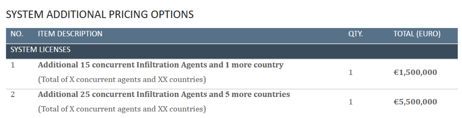 The €16 million project proposal allows for an unlimited number of spyware infection attempts, but the monitoring of only 10 devices simultaneously. For an additional €1.5M, the customer can purchase the ability to monitor 15 additional devices simultaneously, and to infect devices in a single additional country. For an additional €5.5M, the customer can monitor 25 additional devices simultaneously, and conduct espionage in five more countries.