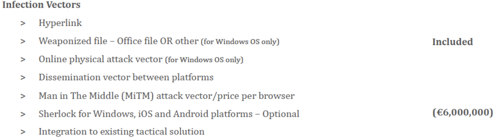 For a further additional €1.5M fee, customers can purchase a remote shell capability, which allows them full access to run any command or program on the target’s computer. This kind of capability is especially concerning, given that it could also be used to download files, such as planting incriminating materials, onto an infected device.