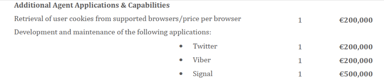 The proposal states that the spyware can exfiltrate private data from a number of apps and accounts including Gmail, Skype, Telegram, and Facebook. The spyware can also capture browsing history and passwords, turn on the target’s webcam and microphone, and take pictures of the screen. Capturing data from additional apps, such as Signal Private Messenger, is sold as an add-on.