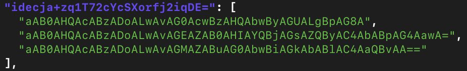 The final blob in KBDMAORI.DAT is the spyware’s configuration in JSON format. The configuration is somewhat obfuscated, but clearly contains Base64 UTF-16 encoded URLs for command-and-control.