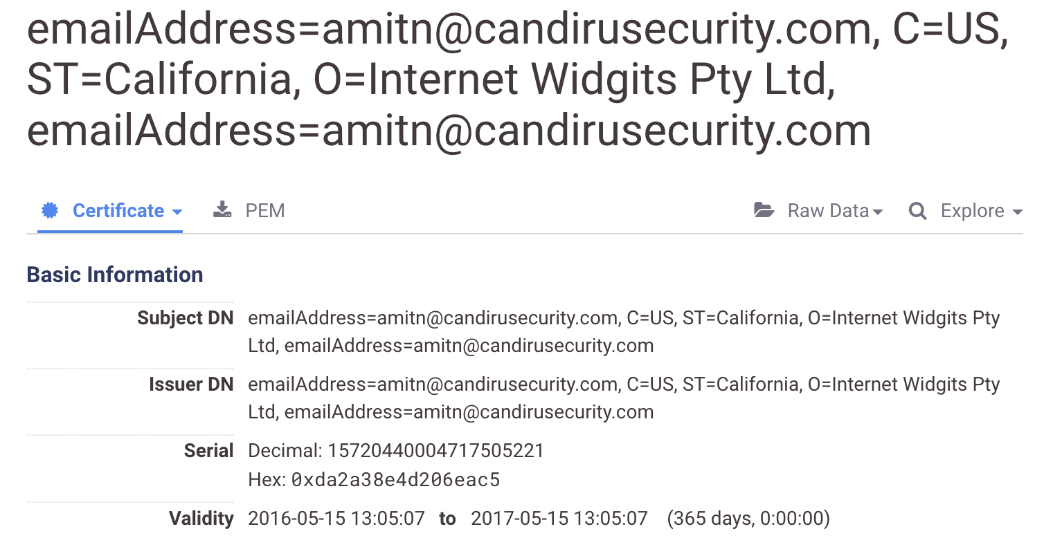 We found 42 certificates on Censys matching CF1. We observed that six IPs matching CF1 certificates later returned certificates that matched a second fingerprint we devised, CF2. The CF2 fingerprint is based on certificates that match those generated by a “Fake Name” generator. We first ran an SQL query on Censys data for the fingerprint, and then filtered by a list of fake names.