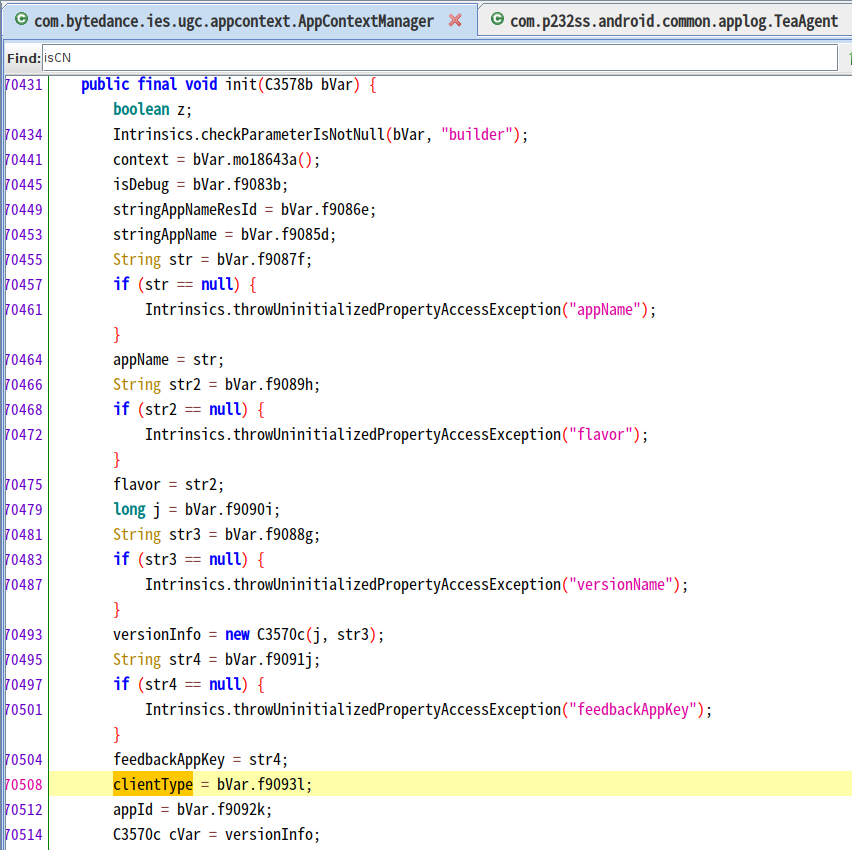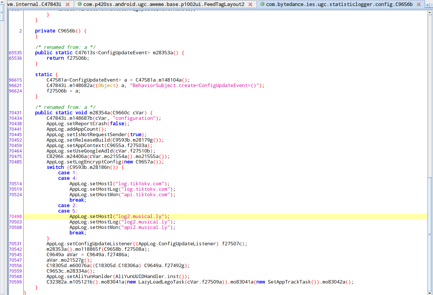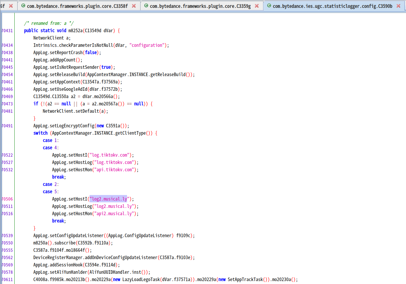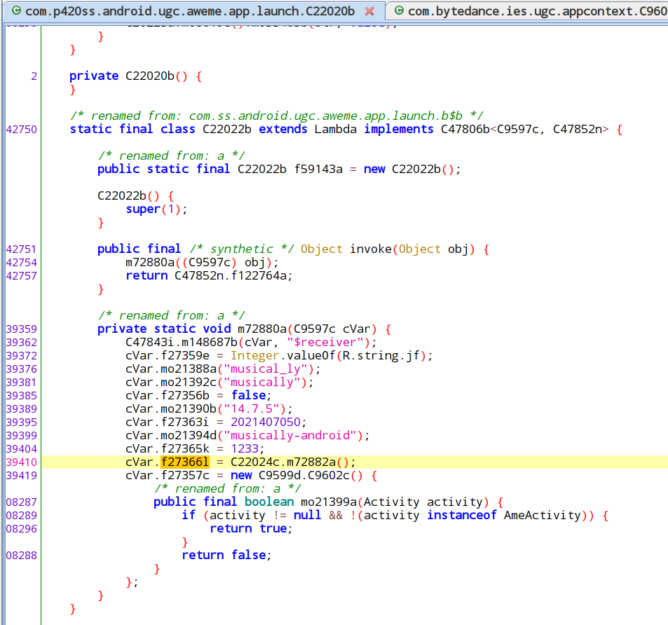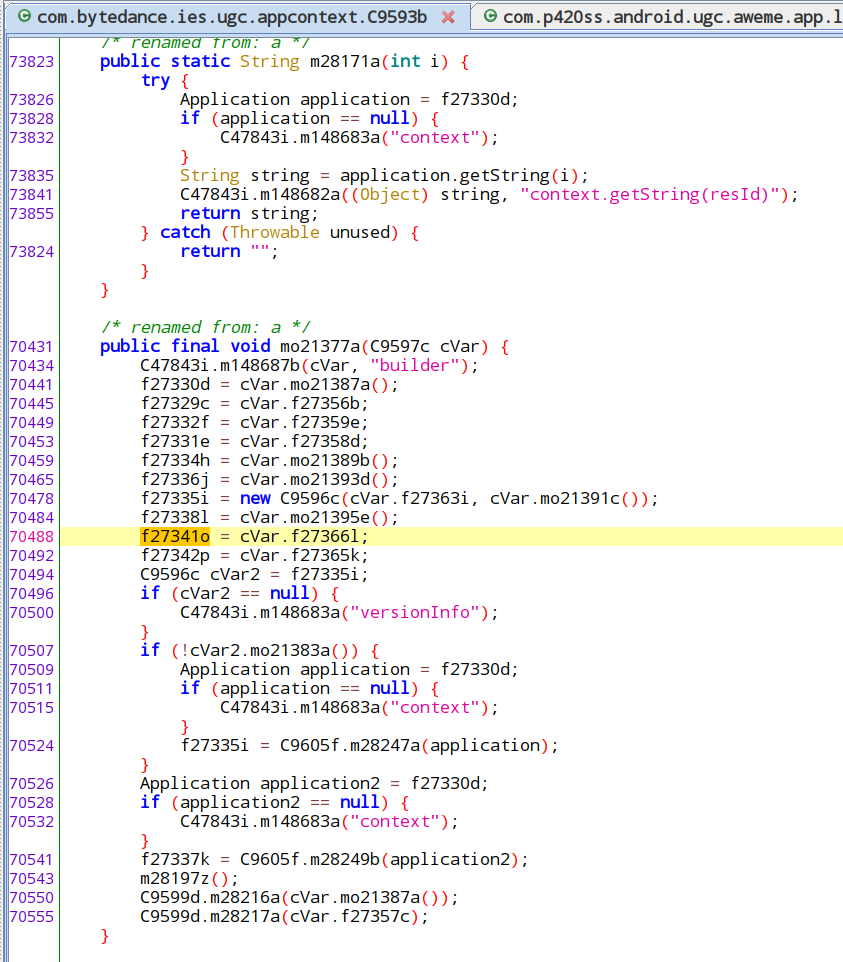 4. In most of TikTok and Douyin source code, Java class, function, and field names are obfuscated to just one single Latin character. To aid reverse engineering, we enabled the “–deobf” option provided by the JADX Java decompiler. The “–deobf” feature renamed these single-character names into more distinguishable alphanumeric names such as “C9656b” in the decompiled Java code. Different versions and settings will cause JADX to generate different alphanumeric names for the same original Java name. The original single-character Java name can be obtained by removing the first leading group of alphabetic plus numeric characters, for example, the deobfuscated name “C9656b” corresponds to the original name “b”. The rest of this report contains both of these two kinds of names.↩︎