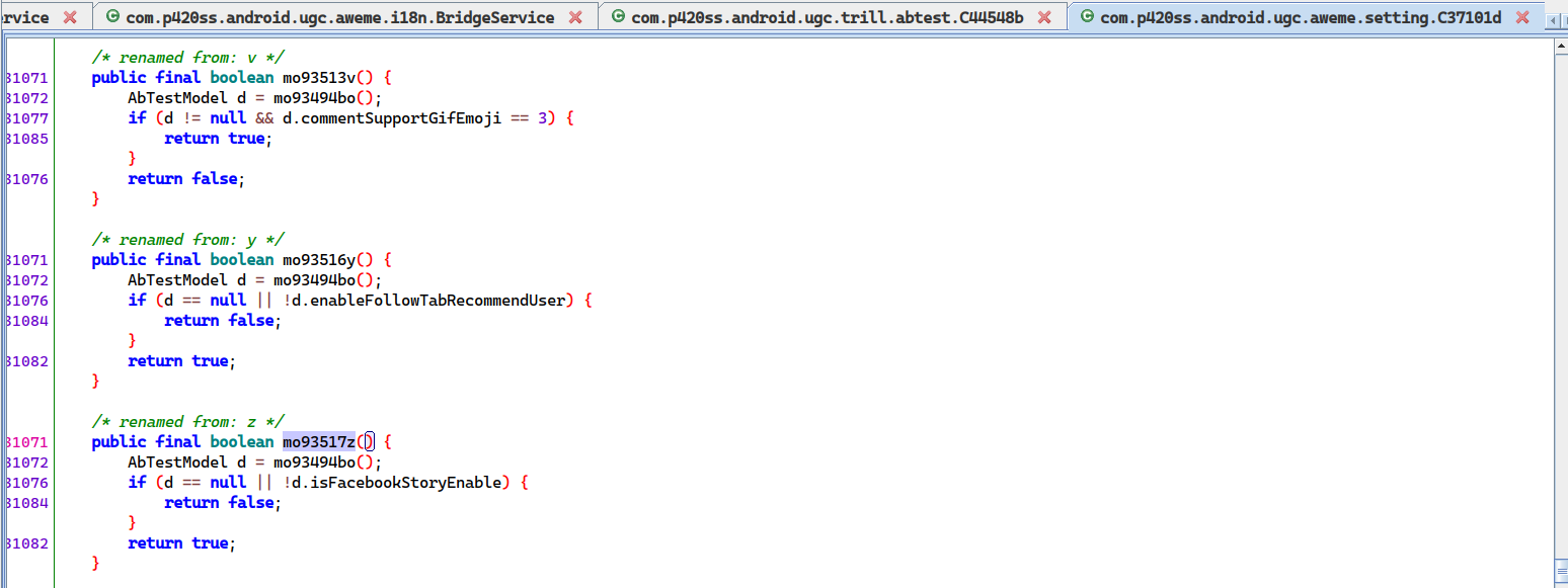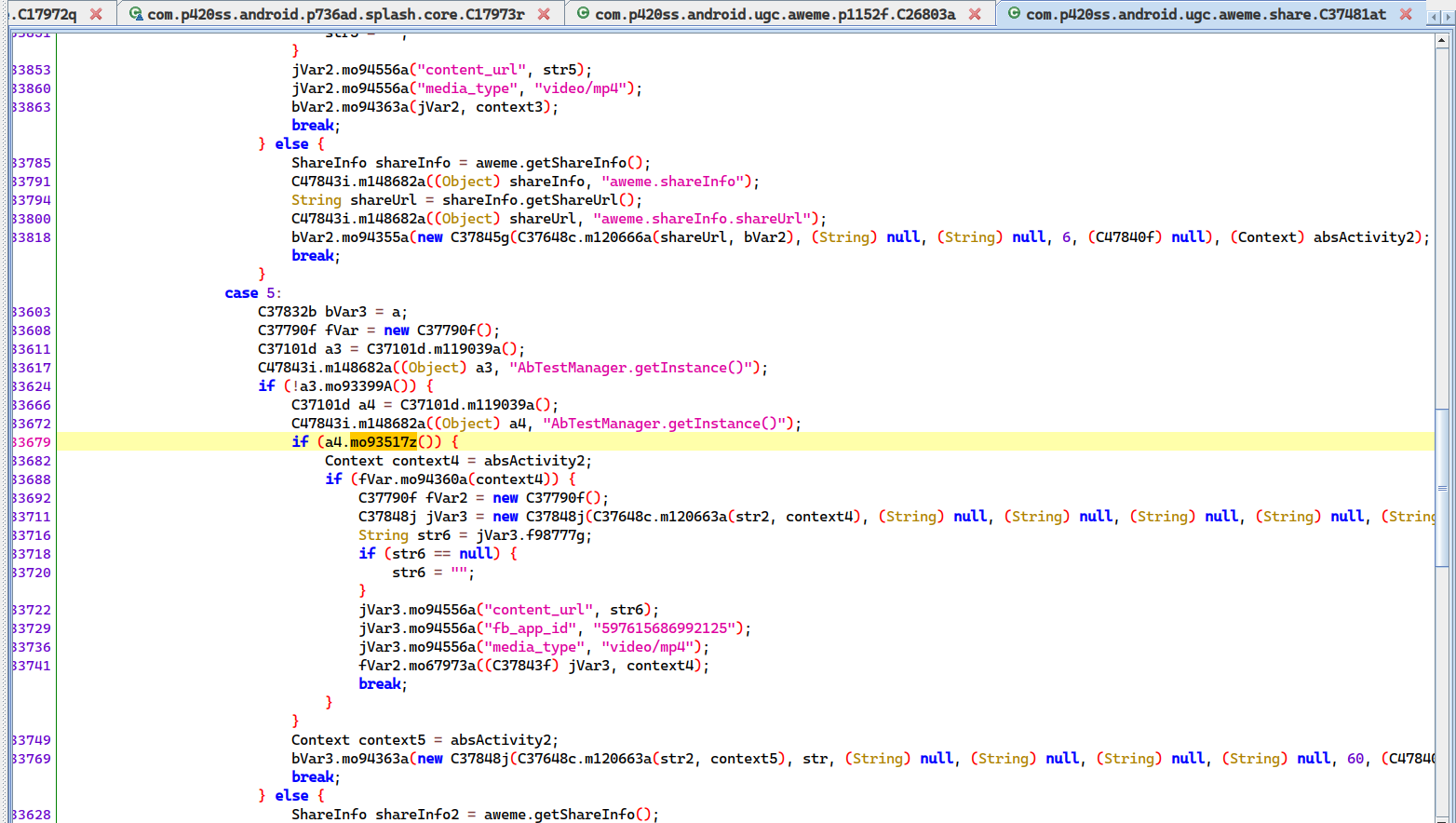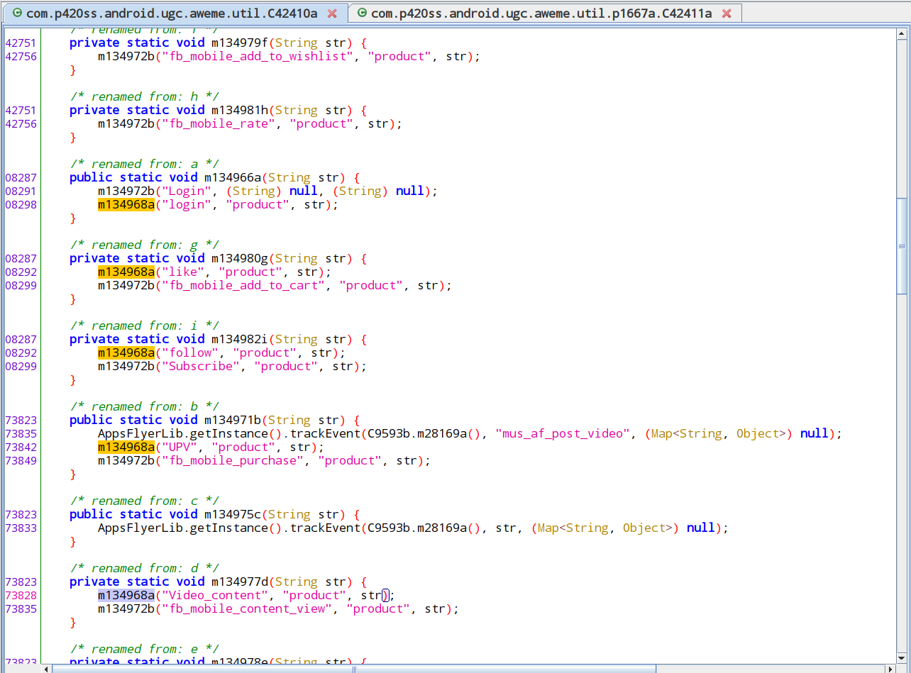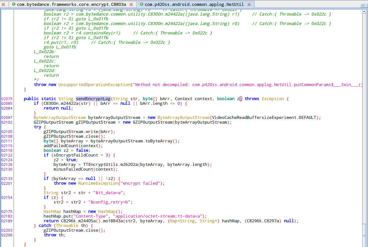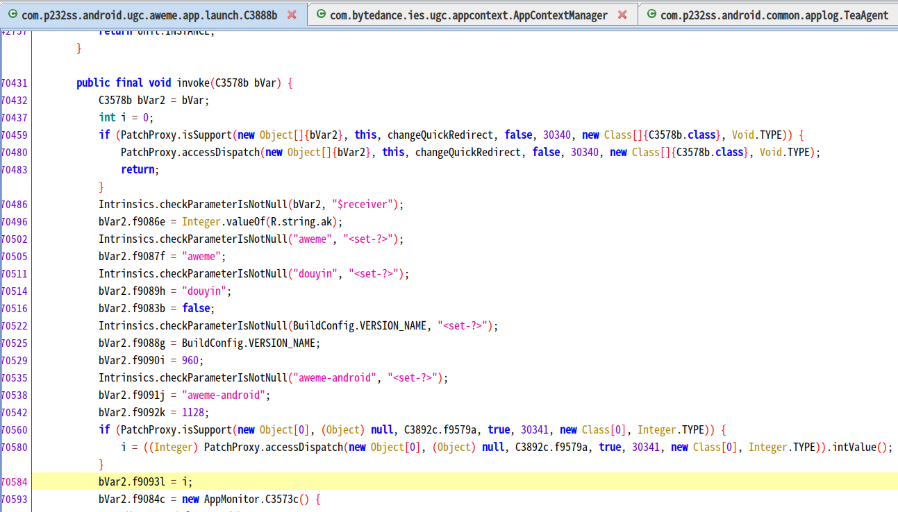 4. In most of TikTok and Douyin source code, Java class, function, and field names are obfuscated to just one single Latin character. To aid reverse engineering, we enabled the “–deobf” option provided by the JADX Java decompiler. The “–deobf” feature renamed these single-character names into more distinguishable alphanumeric names such as “C9656b” in the decompiled Java code. Different versions and settings will cause JADX to generate different alphanumeric names for the same original Java name. The original single-character Java name can be obtained by removing the first leading group of alphabetic plus numeric characters, for example, the deobfuscated name “C9656b” corresponds to the original name “b”. The rest of this report contains both of these two kinds of names.↩︎