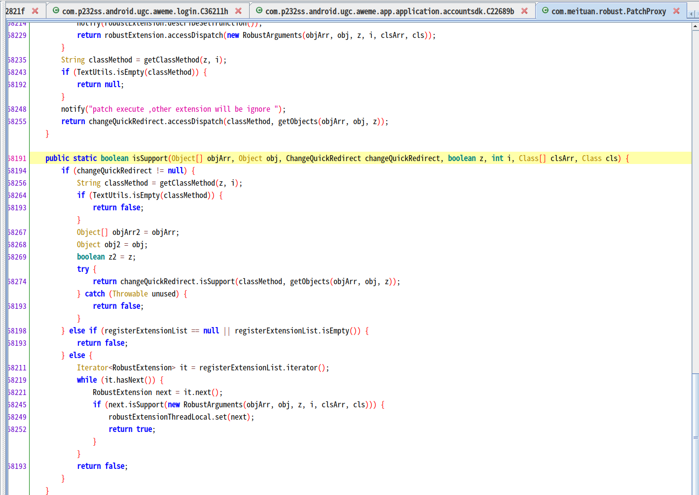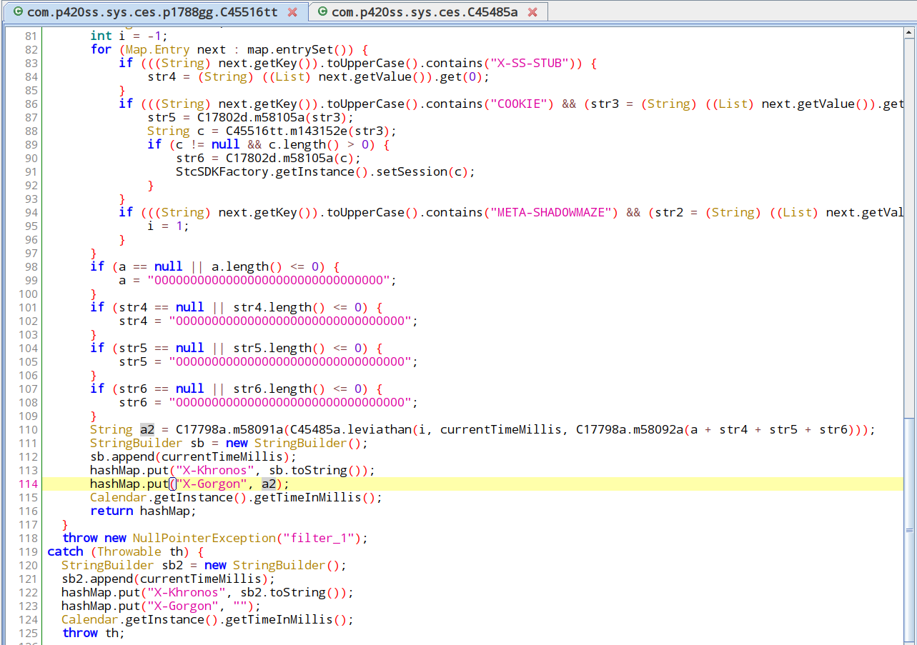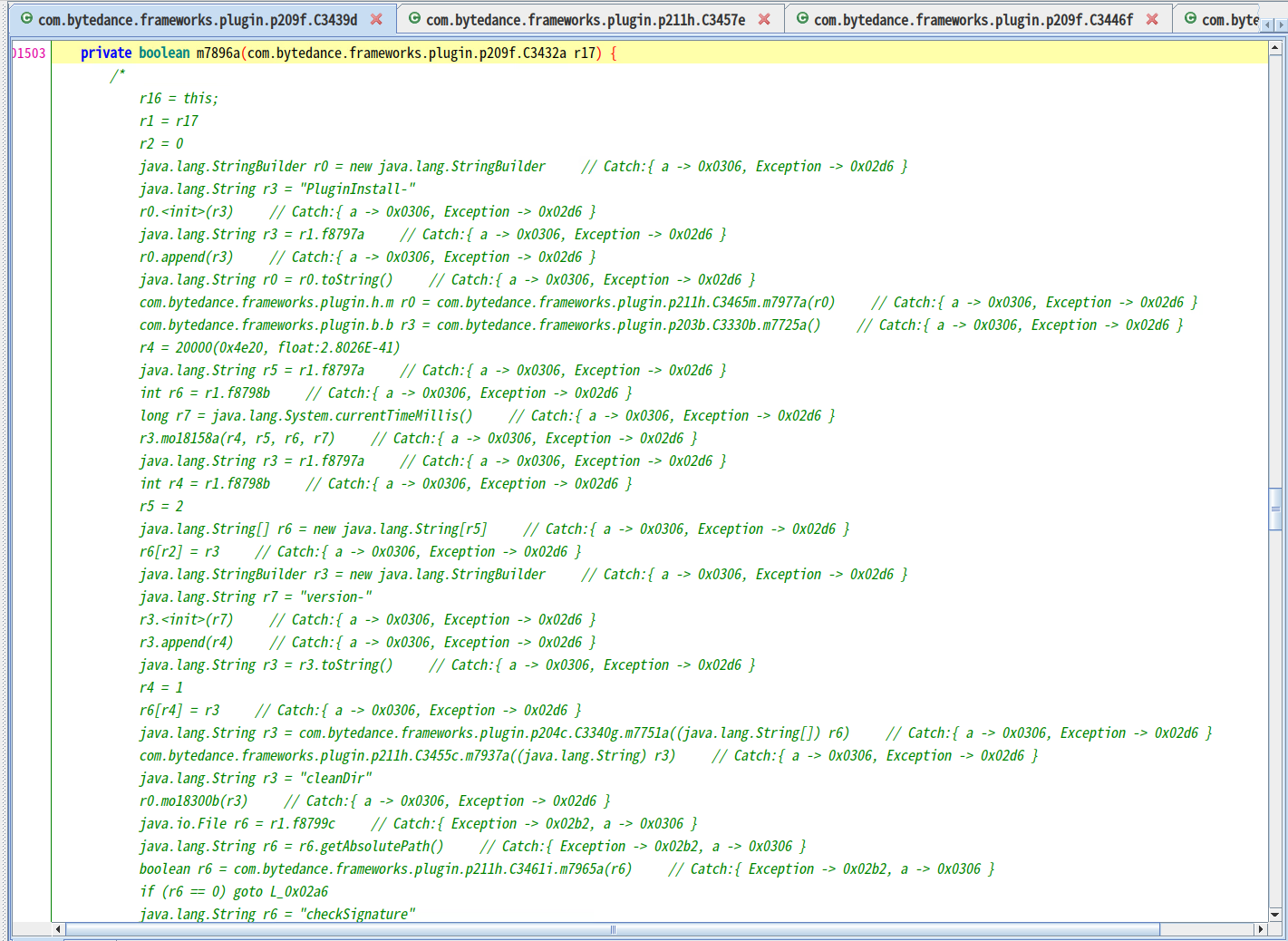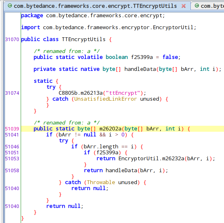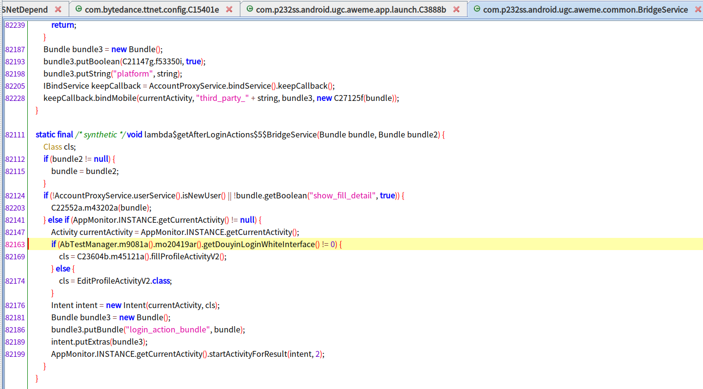 4. In most of TikTok and Douyin source code, Java class, function, and field names are obfuscated to just one single Latin character. To aid reverse engineering, we enabled the “–deobf” option provided by the JADX Java decompiler. The “–deobf” feature renamed these single-character names into more distinguishable alphanumeric names such as “C9656b” in the decompiled Java code. Different versions and settings will cause JADX to generate different alphanumeric names for the same original Java name. The original single-character Java name can be obtained by removing the first leading group of alphabetic plus numeric characters, for example, the deobfuscated name “C9656b” corresponds to the original name “b”. The rest of this report contains both of these two kinds of names.↩︎