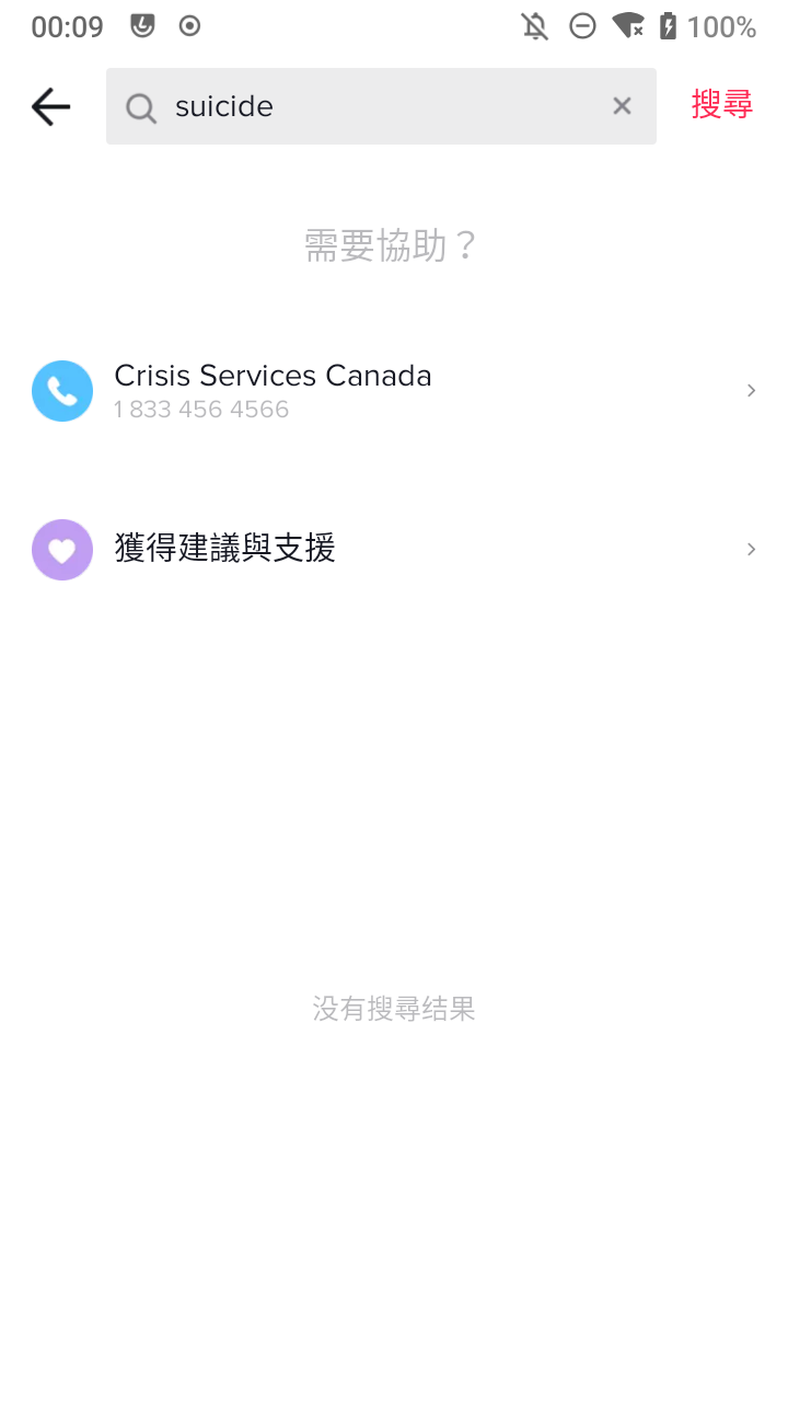 Figure 36: Searching for “suicide” in TikTok returned empty result.