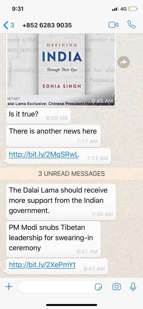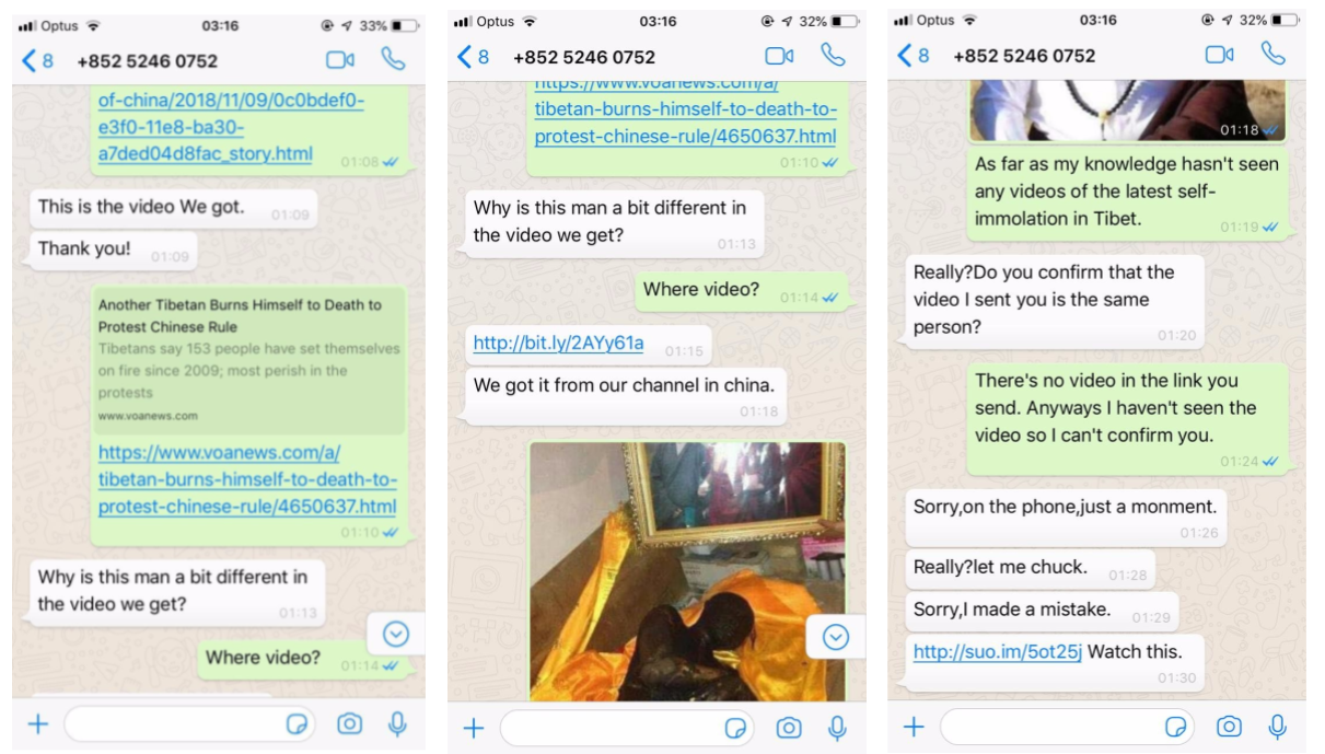The target recalls clicking on the link, but was not infected because their iPhone was running iOS version 12.0.1. Perhaps because the operator did not observe a successful infection, they continued to converse with the target (Figure 2), sharing additional exploit links. Several hours later, the persona explained that they had confirmed information about the self-immolation with contacts at the Central Tibetan Administration, which may have been an effort to make the interaction seem benign to the target.