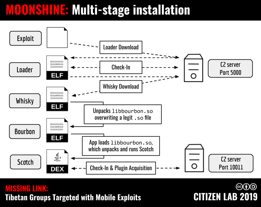 Between November 2018 and September 2019, we collected one iOS exploit chain, one iOS spyware implant, eight distinct Android exploits, and an Android spyware package. The iOS exploit chain only affects iOS versions between 11.0 and 11.4, and was not a zero-day exploit when we observed it. The Android exploits include a working exploit publicly released by Exodus Intelligence for a Google Chrome bug that was patched, but whose patch had not yet been distributed to Chrome users. Other exploits include what appears to be lightly modified versions of Chrome exploit code published on the personal GitHub pages of a member of Tencent’s Xuanwu Lab (CVE-2016-1646), a member of Qihoo 360’s Vulcan Team (CVE-2018-17480), and by a Google Project Zero member on the Chrome Bug Tracker (CVE-2018-6065).