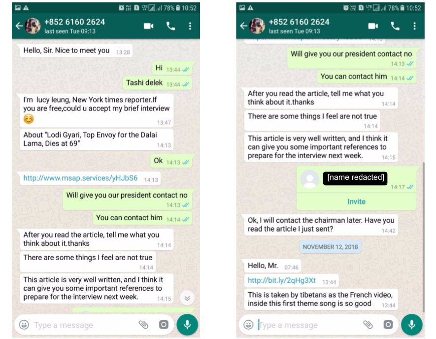 - Between November 2018 and May 2019, senior members of Tibetan groups received malicious links in individually tailored WhatsApp text exchanges with operators posing as NGO workers, journalists, and other fake personas. The links led to code designed to exploit web browser vulnerabilities to install spyware on iOS and Android devices, and in some cases to OAuth phishing pages. This campaign was carried out by what appears to be a single operator that we call POISON CARP.