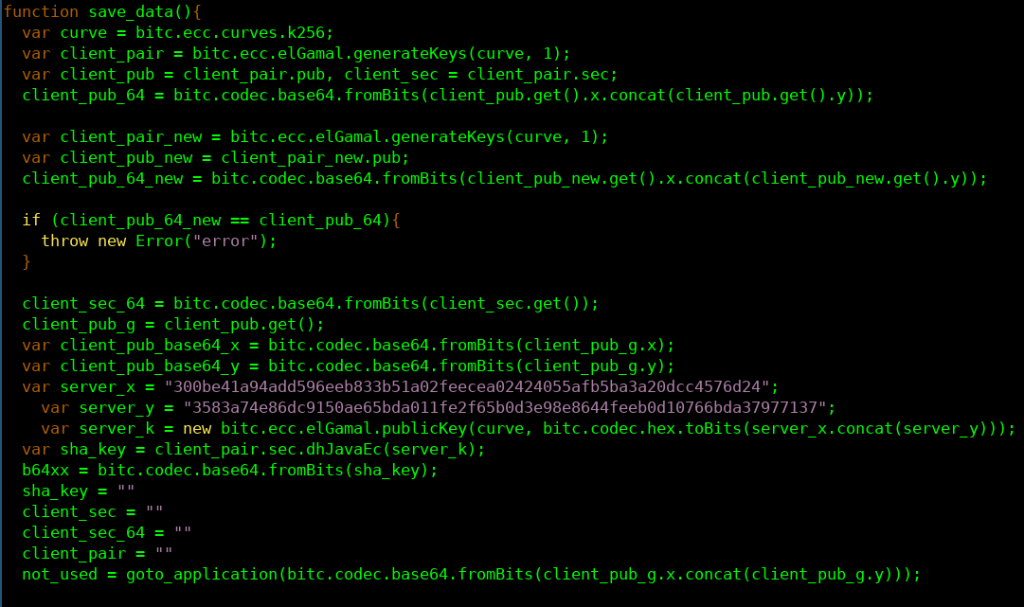 One noteworthy feature of the exploitation process was that the exploits and malcode were encrypted with an ECC Diffie-Hellman (ECDH) key exchange between the target browser and the operator’s server (Figure 4). The encrypted delivery of the exploit and payload would prevent a network intrusion detection system (such as those commonly used in enterprise settings) from detecting malicious code, and prevents analysts from reconstructing and analyzing the malicious code from a network traffic capture alone. Of course, analysts can still extract the malicious code in other ways, such as from memory dumps or browser-based instrumentation.