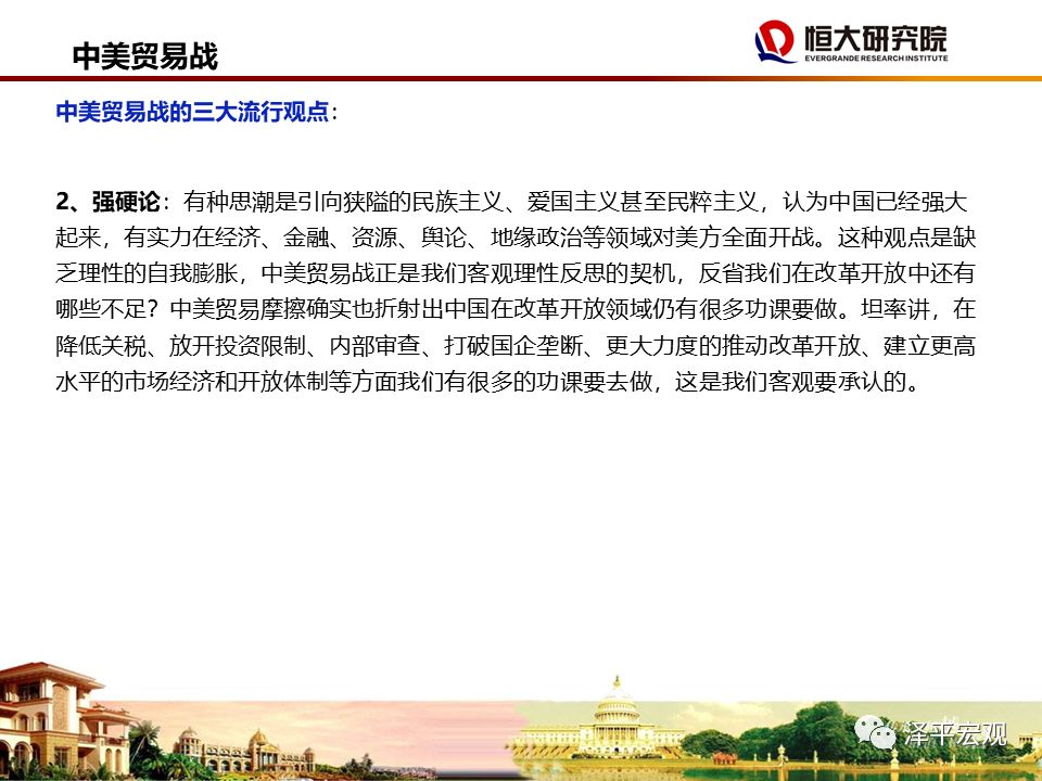 Figure 25: Screenshot of a presentation slide summarizing “popular views on Sino-US trade war”; the slides appear to be made by a research institute affiliated with the Evergrande Group, one of China’s largest property developers.