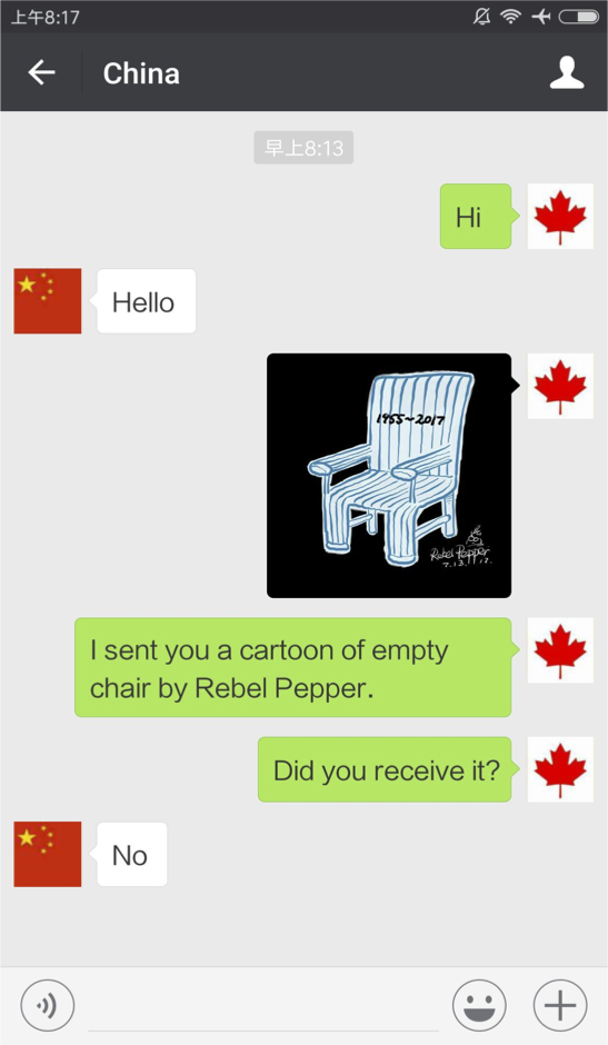 At the additional cost of space, WeChat could maintain a hash index of non-sensitive image hashes, in addition to having a hash index of sensitive image hashes. The use of an additional index would save computational resources, as WeChat would then not have to determine whether any non-sensitive image is sensitive once its hash has been added to the non-sensitive hash index. To test whether WeChat uses a non-sensitive hash index, we generated another collision between a blacklisted image of Liu Xiaobo and of the Citizen Lab logo, and this time we sent the images in the opposite order: the Citizen Lab logo first followed by the Liu Xiaobo image. We then sent the Liu Xiaobo image a second time to test whether it was filtered. We found that sending the Citizen Lab logo first did not prevent the Liu Xiaobo image from being filtered. This result shows that there is no non-sensitive hash index that preempts checking a sent image for sensitivity. One possibility why such a system is not implemented is that a non-sensitive index would need to be invalidated each time WeChat adds a new image to the image blacklist, as hashes previously determined to be not sensitive could have become sensitive.