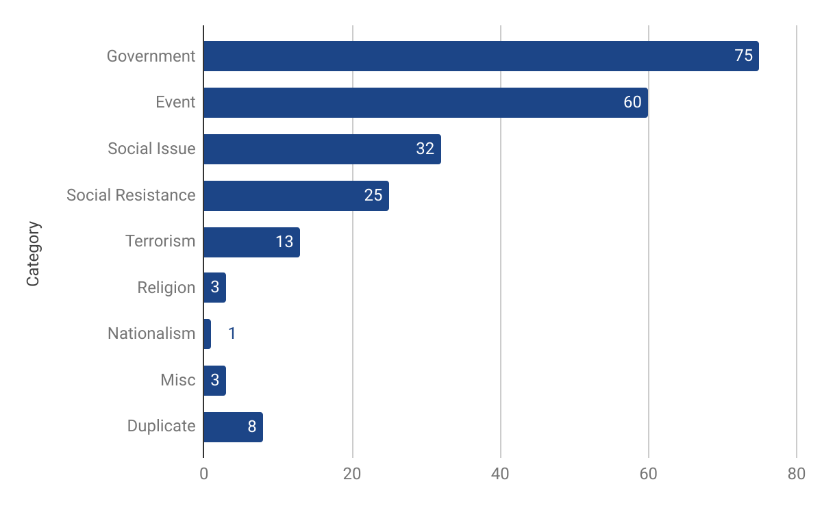 Chinese social media censorship is often reactive to news cycles, and companies tend to tighten their information controls around sensitive events. We found a total of 60 images that reference 10 distinct events: eight news events which happened around or close to our test period and two historical events.