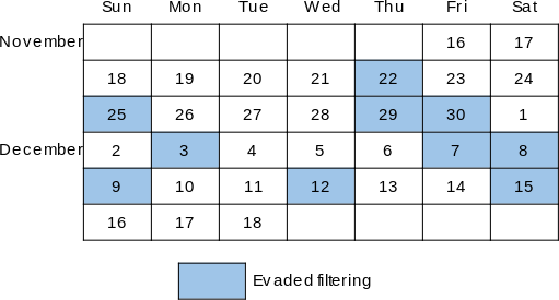 Figure 9: Days between November 16 and December 18 when image v1’s canary image evaded filtering.