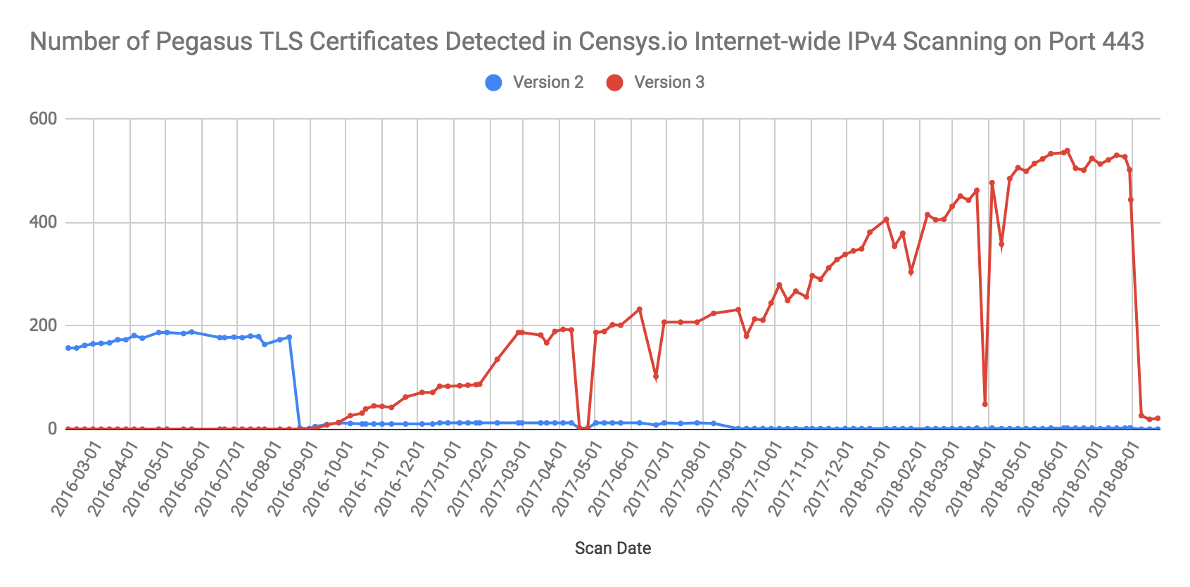 Twelve of the servers that were shut down before we published Million Dollar Dissident (we call these Version 2 servers) were back online in a September 25, 2016 scan and stayed online mostly continuously until an August 10, 2017 scan. These may have been C&C servers for clients that wished to continue monitoring old infections. We saw the first Version 3 server in a September 5, 2017 scan, less than two weeks after Million Dollar Dissident. Approximately one month after Million Dollar Dissident, we saw what appeared to be seven operators online. Two months after our report, we saw 14 operators online.