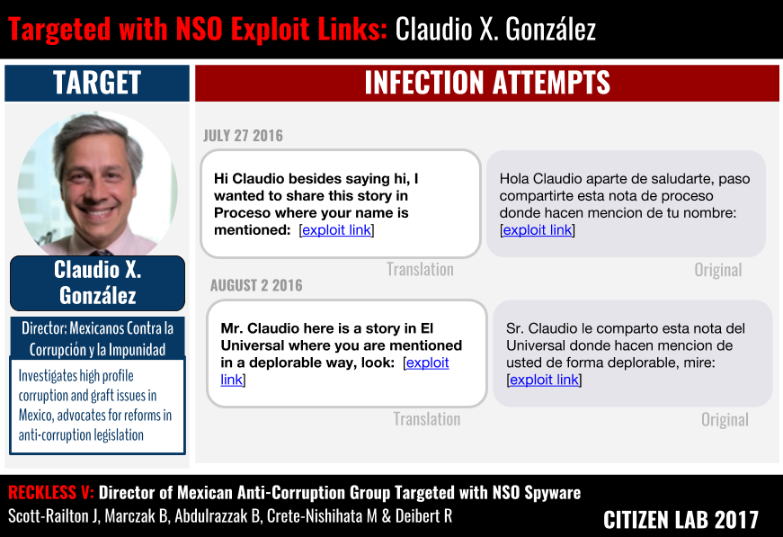 Citizen Lab would like to thank Claudio X. González who, along with the other targets that have participated in this investigation, make these investigations possible by consenting to share the targeting.