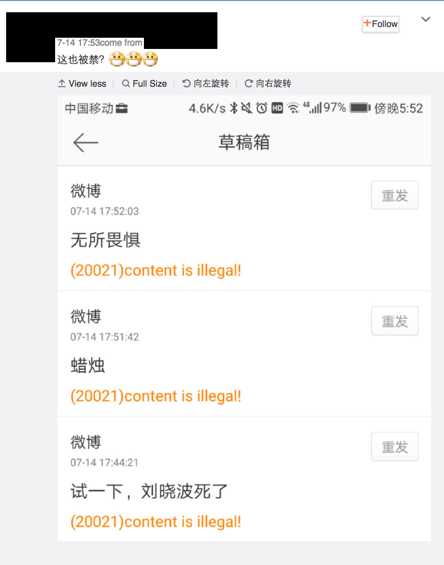 However, since his passing, even searches that only contain his given name (Xiaobo, 晓波, or 曉波) are blocked. According to testing by GreatFire, his given name was accessible as recently as June 14. Like WeChat, Weibo has intensified censorship, recognizing that Liu’s passing is a particularly sensitive event.