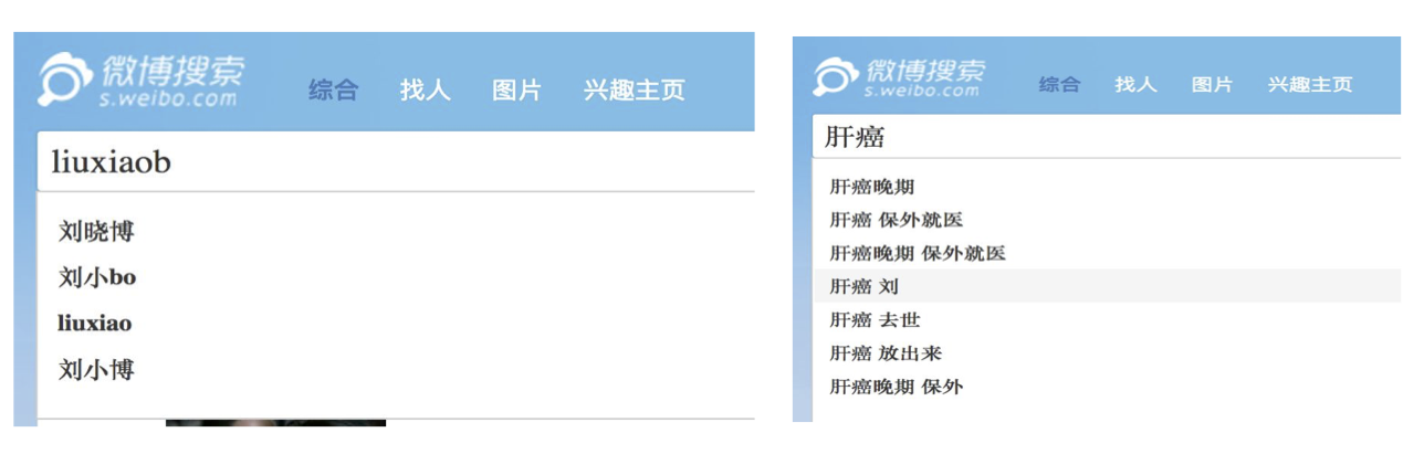 For many keywords, an autocomplete feature will recommend queries based on partially-entered searches. This search feature is common on search engines such as Google. For example, searching for 肝癌 (liver cancer) returns auto-suggestions like 肝癌 去世 (liver cancer, pass away) and 肝癌 刘 (liver cancer, Liu). However, when users enter terms in pinyin, the suggested keywords algorithm converts the search request and returns possible Chinese search terms. For example, entering “liux” will return suggestions like “刘xiao” and “刘小博”; “liuxiaob” returns “刘小bo”. And in cases when a partially-entered query contains blocked keywords or is too specific, the user does not receive recommendations.