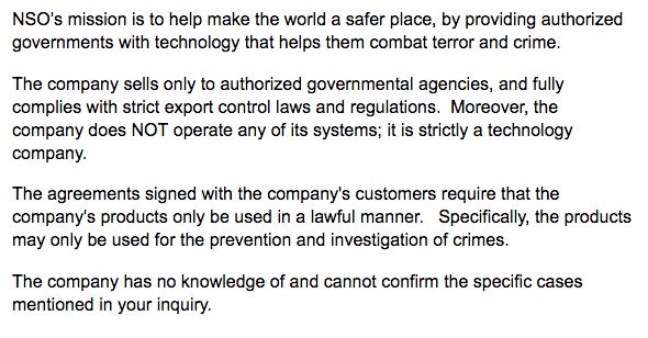 In response to prior Citizen Lab reporting, NSO has claimed that “their mission is to help make the world a safer place, by providing authorized governments with technology that helps them combat terror and crime.” The company claimed that it “fully complies with strict export control laws and regulations.” Implying that they have limited ability to see exactly how their product is used, NSO Group stated that “the company does NOT operate any of its systems.” Furthermore, NSO Group claims that its “products may only be used for the prevention and investigation of crimes.”