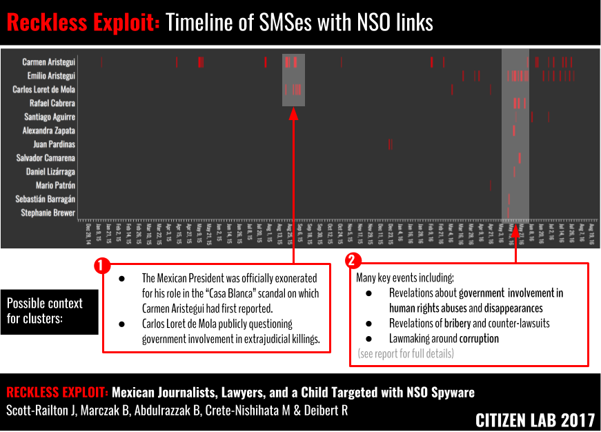 The timeline shows at least two periods of intense targeting that our collaborators have connected to key events in Mexican politics.