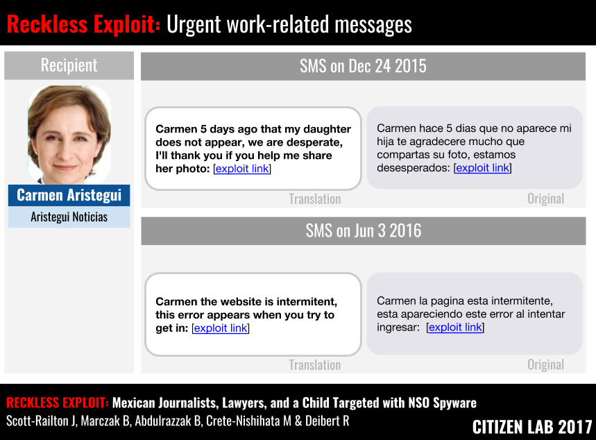 On January 12 2015, Carmen Aristegui received a text message saying that the “previous message was not sent” along with a link that led to NSO Group’s Exploit Framework. Over the next year and a half, Aristegui received a further 25 messages that included NSO links purporting to come from: the US Embassy in Mexico, Amber Alerts, colleagues, people in her personal life, her bank, phone company, and notifications of kidnappings.
