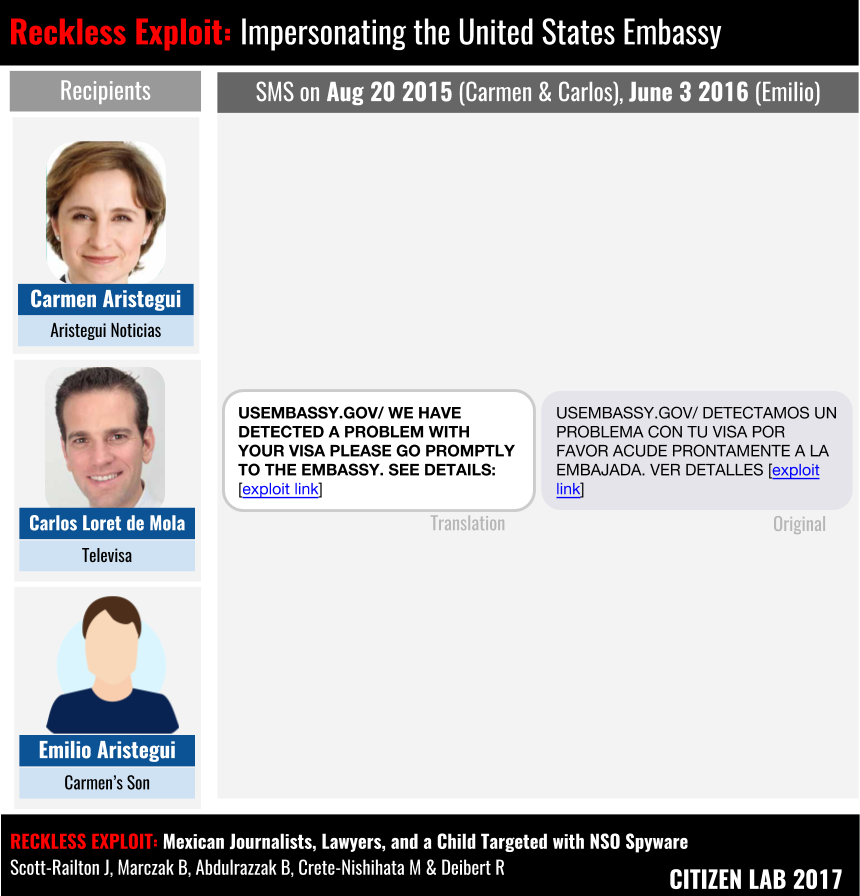 Emilio Aristegui was a minor at the time that many of the messages were sent and received. He was also residing in the United States. On June 3rd, 2016, Emilio received a message purporting to come from the US Embassy in Mexico, concerning the status of his visa (See: Figure 11). The message was sent from a Mexican number to a phone located in the US. While his mother Carmen Aristegui, and Carlos Mola also received similar messages in 2015, the fact that the message, among others, was sent to someone in the US may have violated US law (See Section 4: Reckless Targeting).