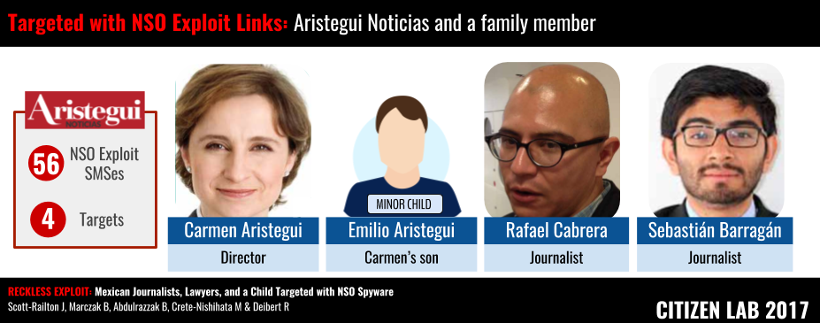 In the past several years, Aristegui Noticias has been heavily involved in major investigations. In the original Citizen Lab report on NSO Group, we presented evidence that journalist Rafael Cabrera (a reporter with Aristegui Noticias, and now BuzzFeed) was targeted with NSO exploit links. We now know that his colleagues Sebastián Barragán and Carmen Aristegui were also among the targets.