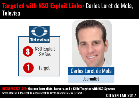 Carlos Loret de Mola is a well known journalist and on-air personality for the Mexican national television channel Televisa. The NSO messages first arrived in August 2015 during a period when he was covering a massacre that took place on May 22, 2015 at a farm known as “Rancho El Sol” in western Mexico. Loret was reporting on the possible involvement and subsequent cover up of elements of the Mexican Federal government in the disappearance of 42 persons that took place at Rancho El Sol.