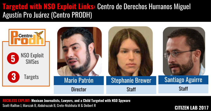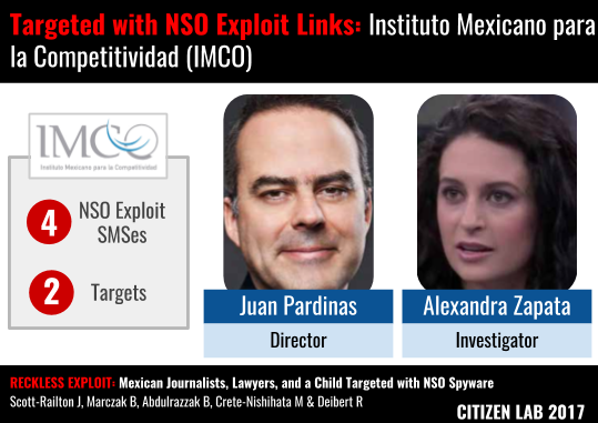 Staff and directors of two Mexican civil society organizations were also targeted using NSO exploit links: Centro Miguel Agustín Pro Juárez (Centro PRODH) and the Mexican institute for Competitiveness (IMCO).