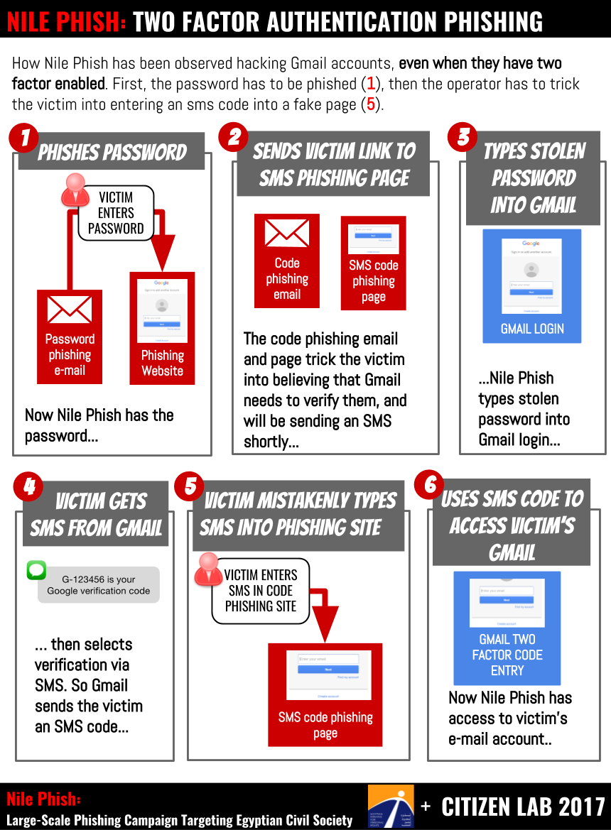 Since publication, Citizen Lab and EIPR have been contacted by a number of additional targets. These targets provided us with a range of evidence for additional activities by Nile Phish. Importantly, it also appears that Nile Phish has engaged in phishing users of 2 factor authentication. The following illustration describes this process.