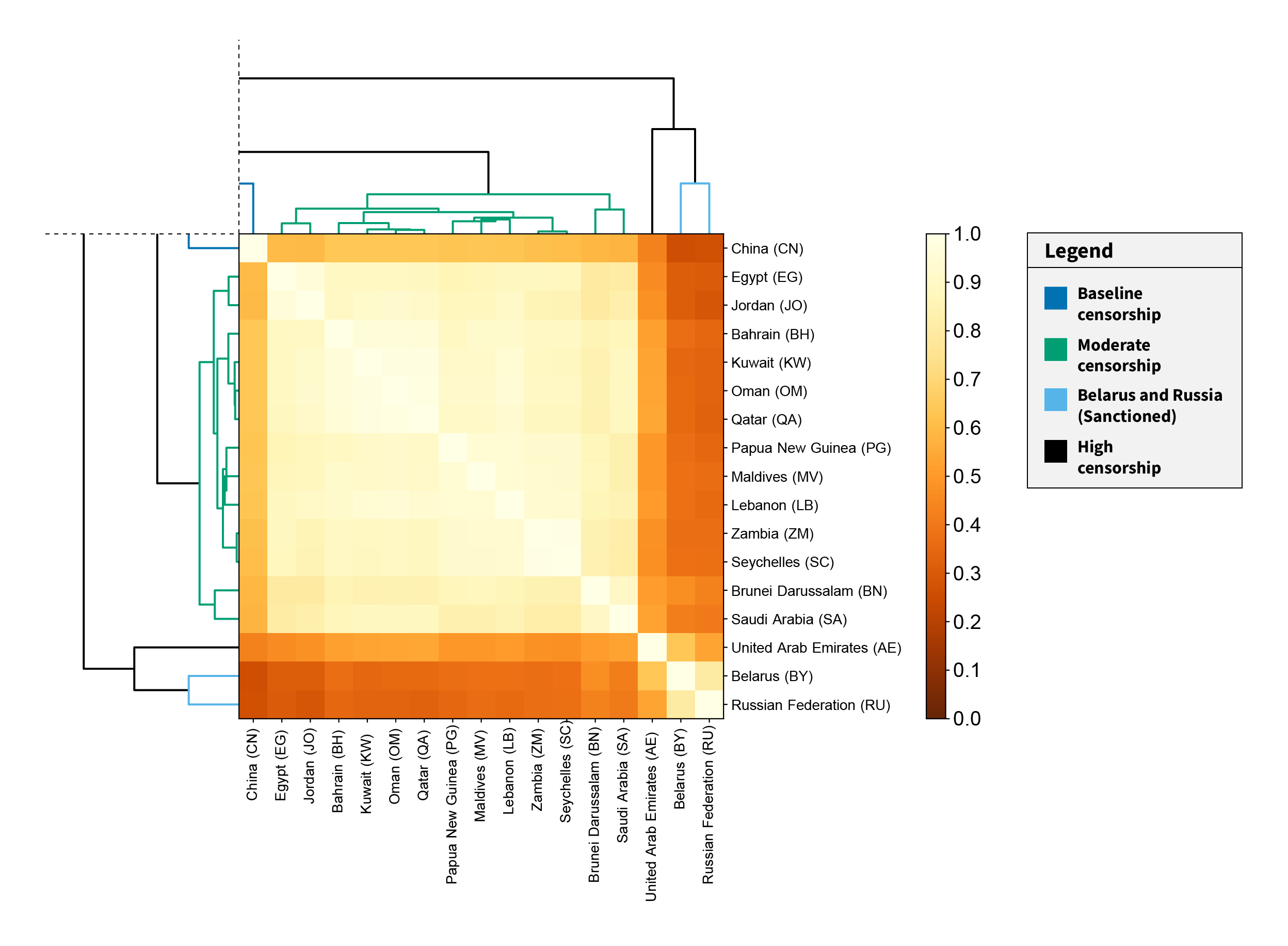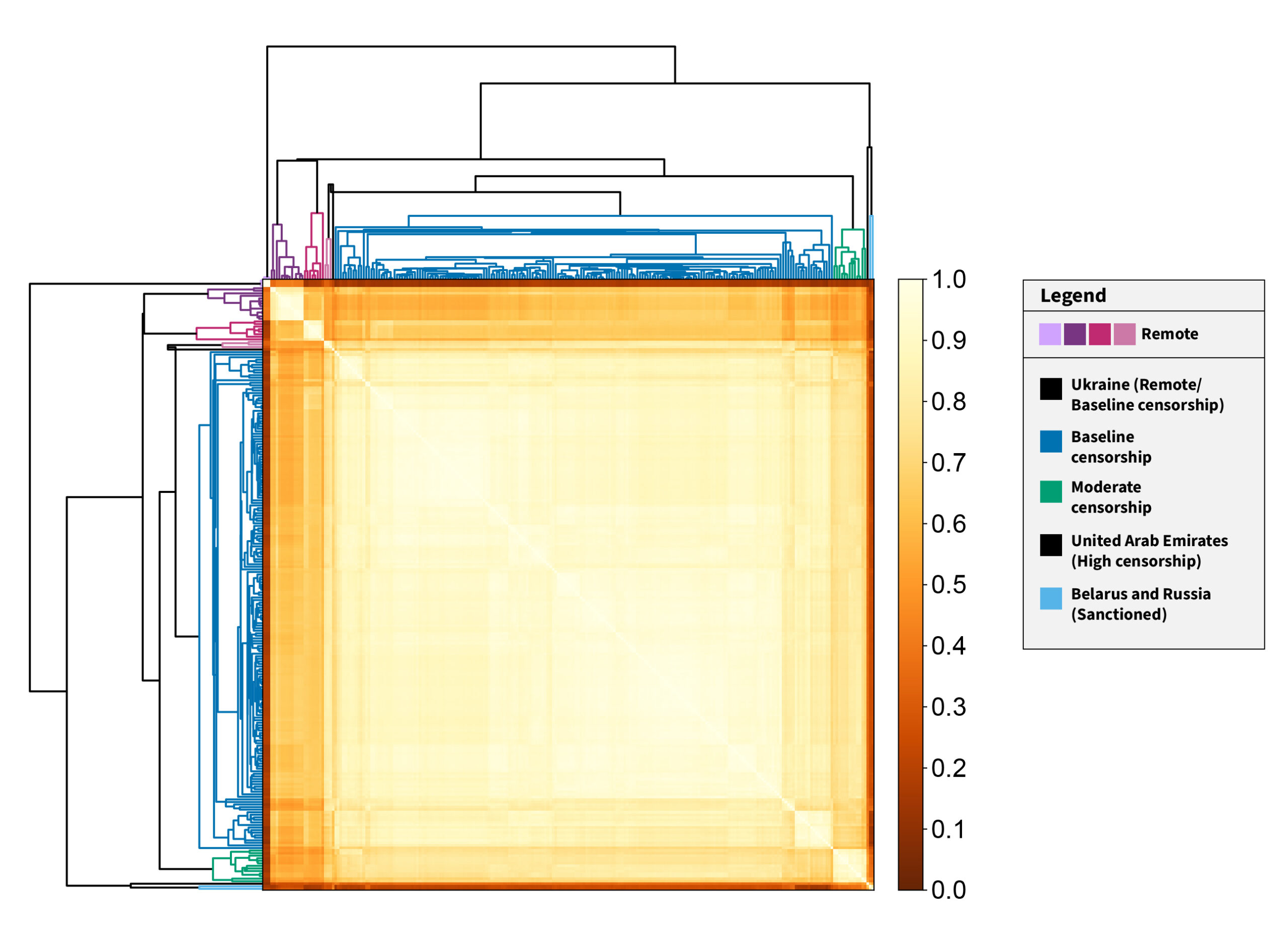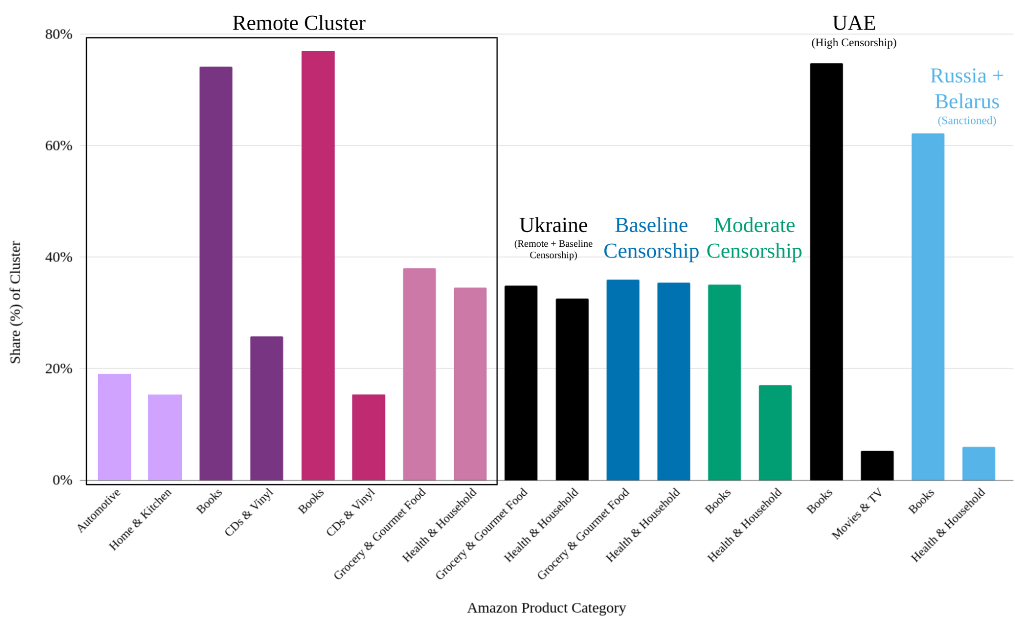 While our analysis fleshed out various reasons for restrictions on shipping, including the remoteness of unpopulated islands or Amazon’s voluntary sanctions against Russia and Belarus, we note that when we restrict our concern to only politically and religiously motivated censorship, we observe three clusters: the baseline censorship cluster, the moderate censorship cluster, and the high censorship cluster.