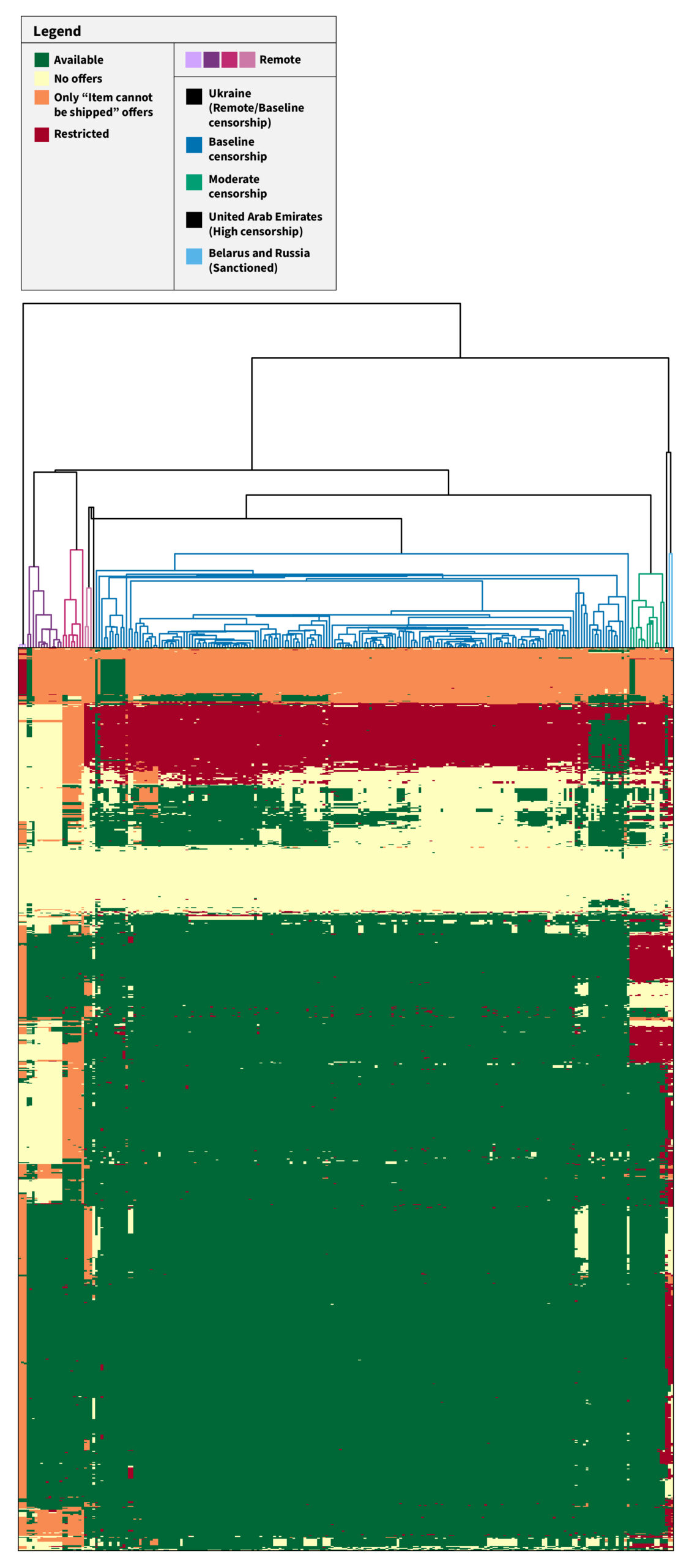 There are still many unanswered questions, such as why some regions show this message versus others, such as Belarus and Russia in the sanctioned cluster, do not. However, without completely understanding the exact reasons for such distinctions, we can still use these distinctions as useful signals for clustering regions and products by various restriction motivations, including censorship or other motivations which may be more benign, such as appears to be the case for the “item cannot be shipped” products.