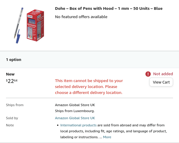 “This item cannot be shipped to your selected delivery location. Please choose a different delivery location.”