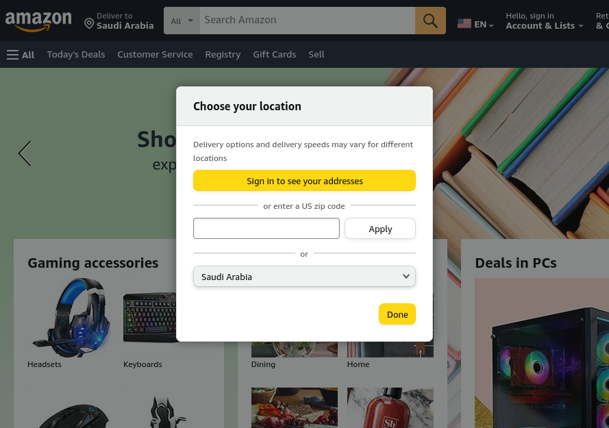 Figure 1: Amazon’s location selector after having selected “Saudi Arabia”.