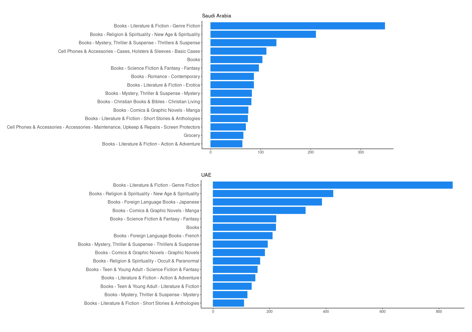 In our study we encountered some limitations relating to language diversity. Although our study ultimately included books in multiple languages, such as English, Japanese, and French, it notably did not encompass any Arabic books, which are critically relevant in both the UAE and Saudi Arabia. The lack of representation of such books may be due to a miniscule representation on the American Amazon site — amazon.com — or due to a sampling bias of Common Crawl.