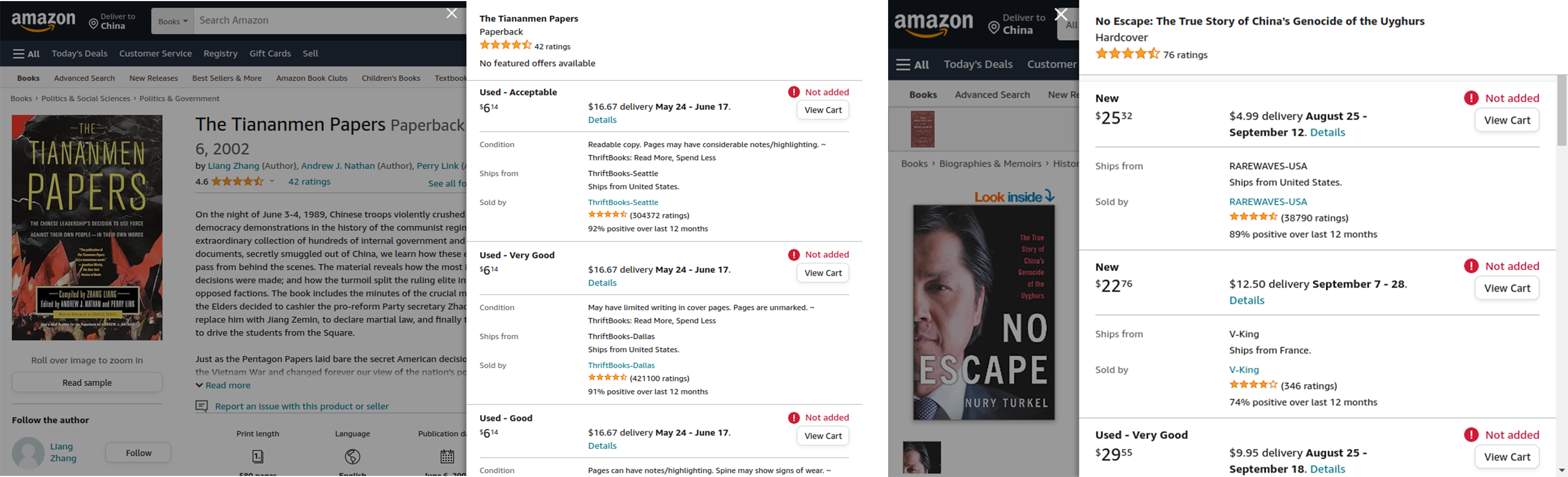 Figure 16: Left, Tiananmen Papers censored when shipping to China; right, No Escape: The True Story of China’s Genocide of the Uyghurs censored when shipping to China.