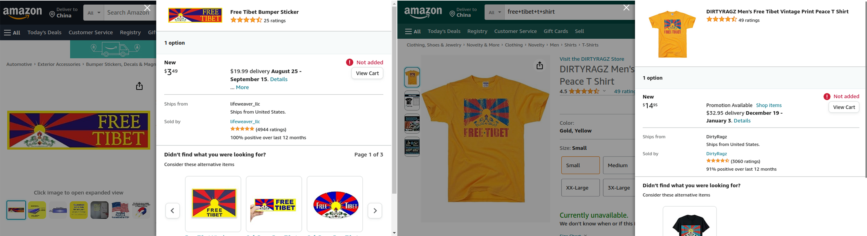 “Free Tibet” bumper sticker (left) and t-shirt (right) censored when shipping to China.