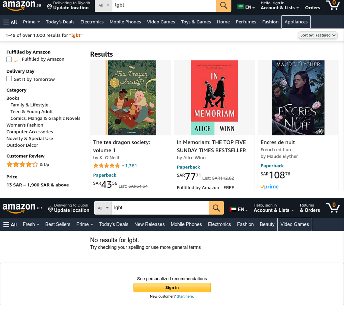 Search results for “lgbt” from Saudi Arabian (top) and the UAE (bottom) Amazon store fronts.